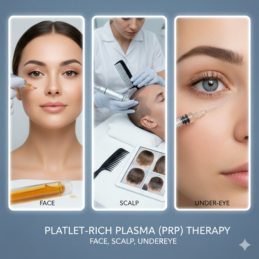 Uses your own blood plasma, rich in growth factors, to stimulate cell renewal. Commonly used for skin rejuvenation, hair regrowth, and reducing under-eye dark circles.