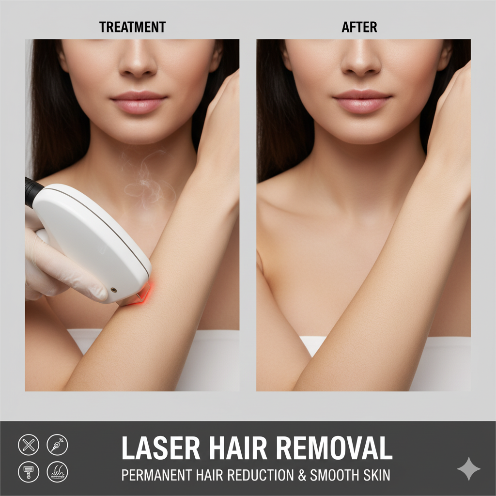 Permanent hair reduction treatment that targets hair follicles to prevent regrowth. Effective on face, underarms, bikini area, and legs.